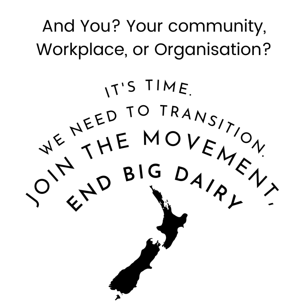We are united by the need to END BIG DAIRY and create a rapid, just transition to a regenerative, plant-based, carbon-negative economy that honours Te Tiriti o Waitangi.